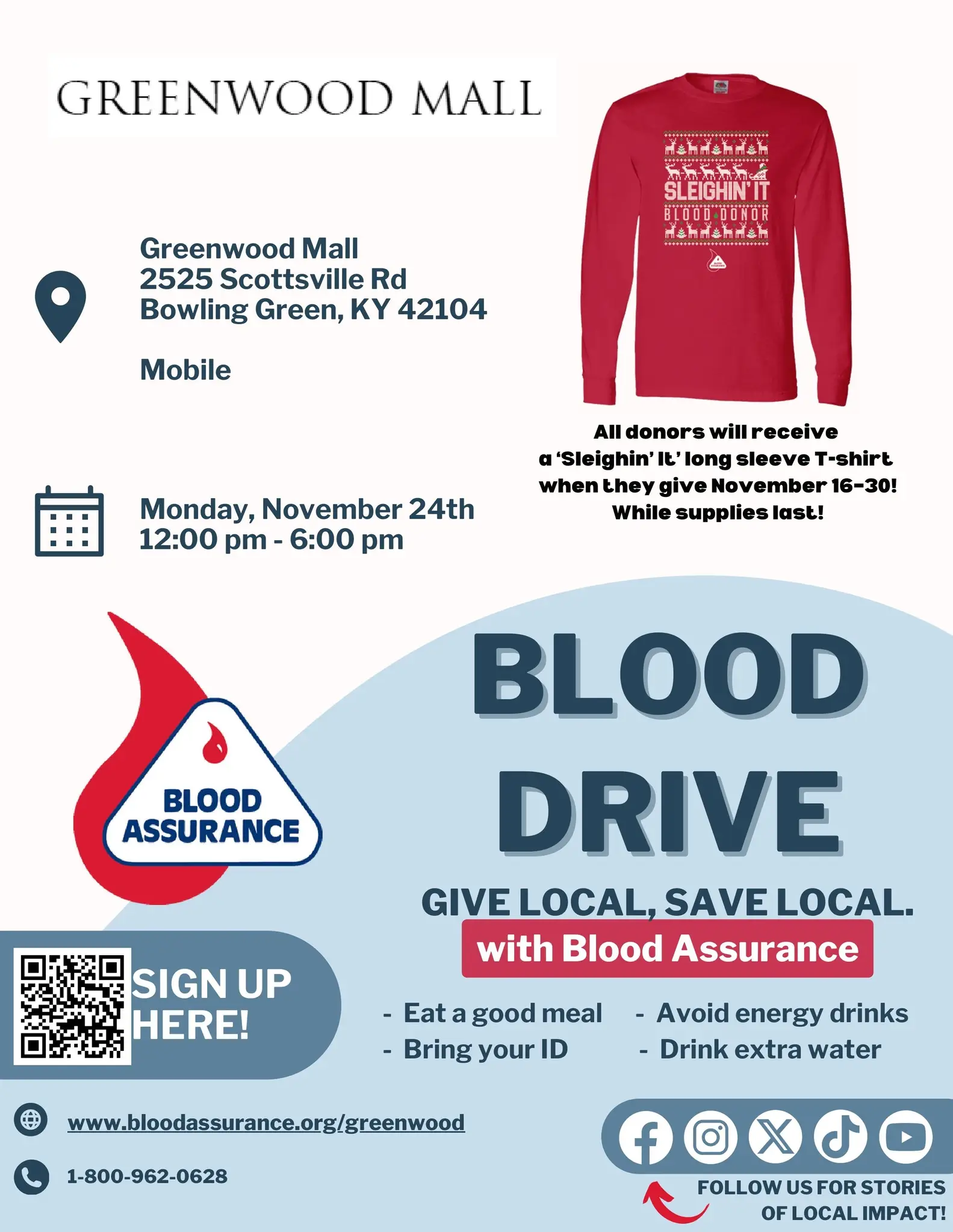 Sign up to be a Blood Assurance donor this Holiday Season! The bloodmobile will be here on November 24th and December 29th. All donors participating between November 16th-30th will receive a festive long sleeve T-shirt while supplies last!